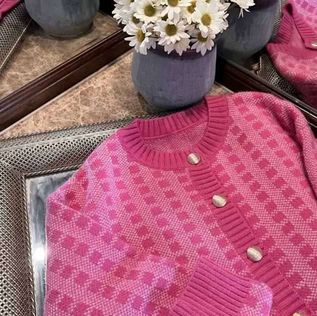 Y2k Pink Women Cardigan Korean Sweet Plaid Long Sleeve Female Sweaters Harajuku New O Neck Preppy Style Ladies Tops